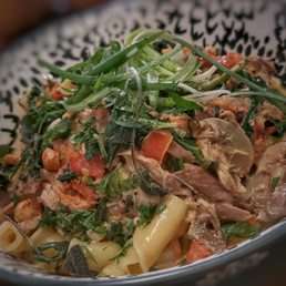 Warm Crisp Artichoke Hearts, Grilled Radicchio, Chickpeas, Avocado, Heirloom Quinoa, Parmesan, Creamy Pesto Dressing, Aged Balsamic
